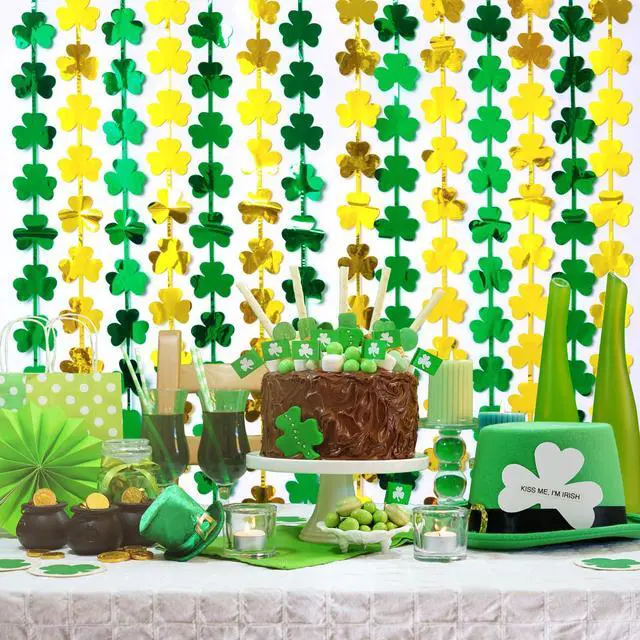 PACKAGE: 2-pack green and gold shamrock shape foil fringe curtains, extra large size (width x drop) 79.2 x 39.6 x 0.04 inches each, perfect for St Patricks Day Decorations, St Paddy's Day, and Irish party decorations. Our shamrock foil fringe curtains will bring luck and create a festival atmosphere for your family.
