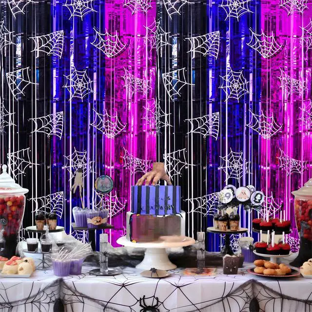 Birthday Party Supplies: 2 packs of foil fringe curtains printed with a Spider Web pattern, size: 79.2 x 39.6 x 0.04 inches each, fantastic horror photo prop backdrop for a themed party.
