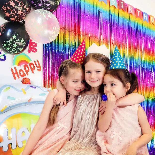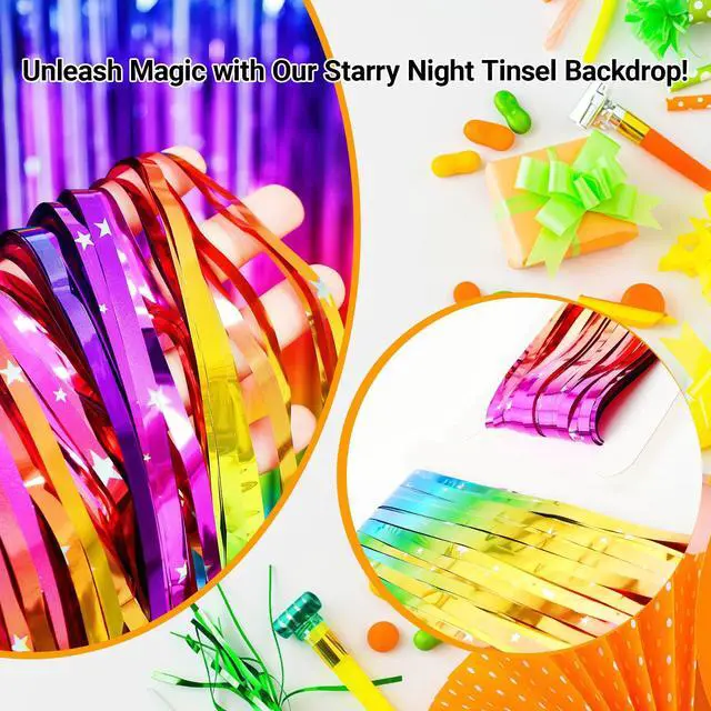 [Rainbow Metallic Tinsel Foil Fringe Curtains]: Add a touch of shimmer to your party with these delightful curtain backdrops made of tinsel boasting a shiny surface. Perfect for enhancing the festive atmosphere as decorations for various occasions.