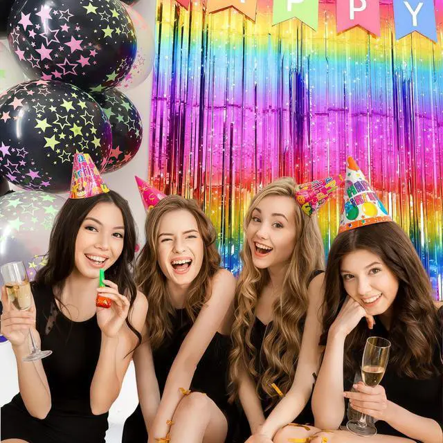 Pack of 4 Sparkly Neon Rainbow Foil Fringe Curtain Backdrop Metallic Streamers Photo Booth Props for Birthday Bachelorette Gay Pride Day Graduation Wedding 80s 90s Disco Party Decorations -3.3x6.6Ft
