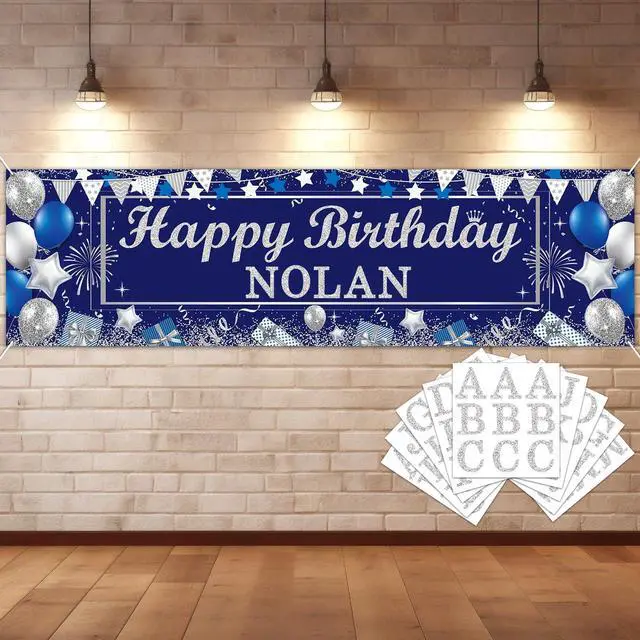 Personalized Birthday Banner Happy Birthday Party Decor Custom DIY Silver and Blue Birthday Party Backdrop with Name Alphabet Letter Sticker Happy Birthday Sign Party Supplies for Men Women