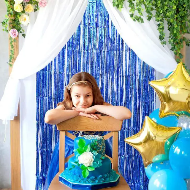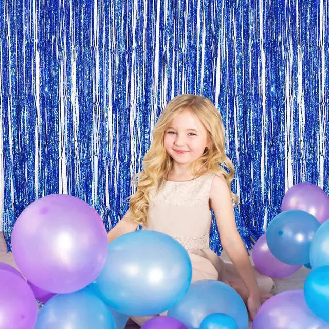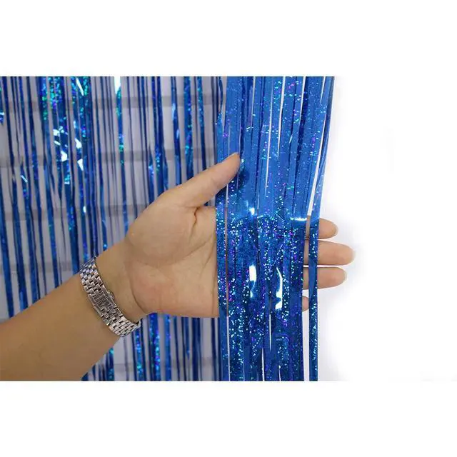 [IRIDESCENT PARTY SUPPLIES] Our blue foil fringe curtains party background shine beautifully in both dark and bright lighting.