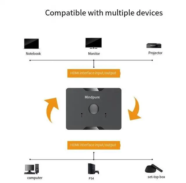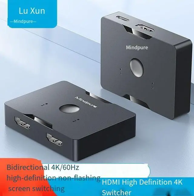 Product parameters Card: Mindpure Product Name: HDMI 2.0 Bidirectional Switcher Model: SW002 Yan Yan Hei Shell material: ABS Joint process: Nickel plating Interface Type: HDMI port to x3 Type-C port to x1 Resolution: 4Kx2K60 /1920x1080P120HzMax