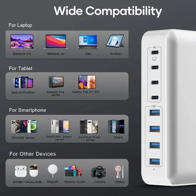 | Other Gadgets | AirPods, Apple Watch, Fitbit, Kindle, GoPro, Switch Host, Switch Dock, DJI Mavic 3 / Air 2S, Steam Deck, Rog Ally, Oculus etc. |