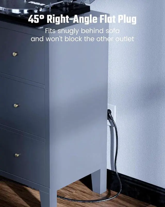 6.5FT Flat Plug Cord & Mountable With 4 T-shape mounting holes on the back, and the included 4 screws and 1 drill template, you can easily mount the flat plug extension cord with multiple outlets horizontally or vertically on walls, behind the TV, or under the desk, leaving you a clutter-free working / entertaining environment! At the end of the 6.5 ft 14AWG heavy-duty cord, the space-saving 45° angled flat plug fits snugly behind furniture and won' t block the other outlet.