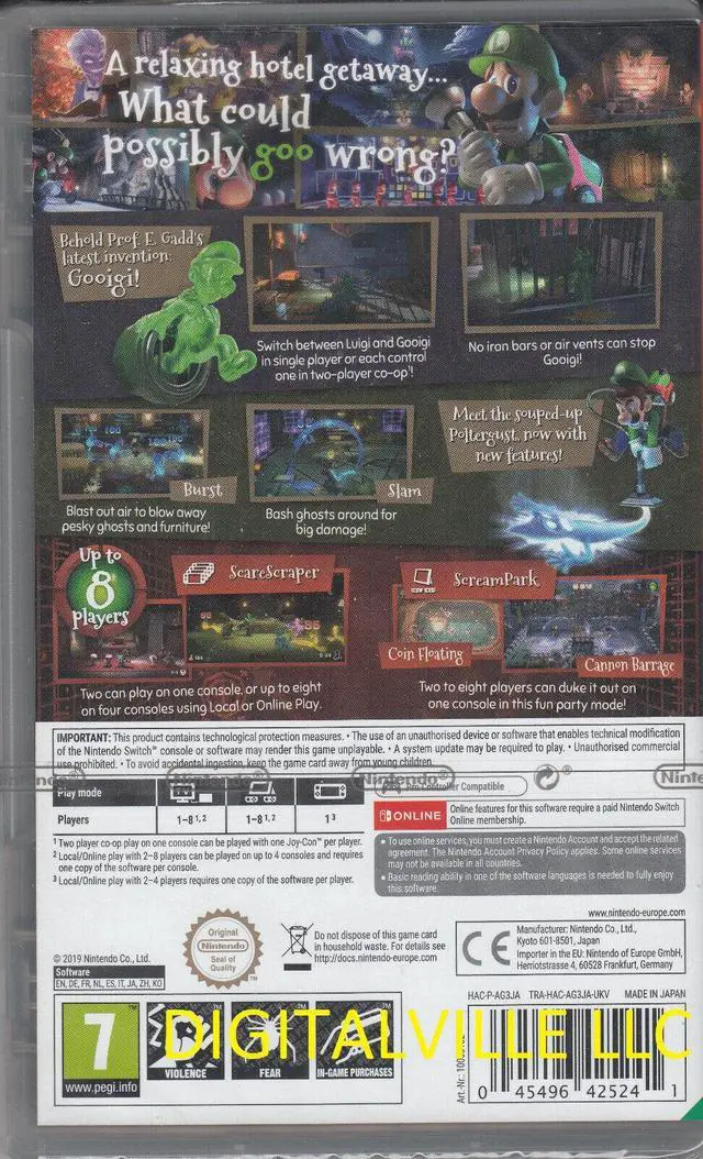 Team up with Professor E. Gadd's latest invention, Gooigi, an all green doppelganger able to slip through tight spaces, walk on spikes, and otherwise help Luigi overcome obstacles he can't get past alone