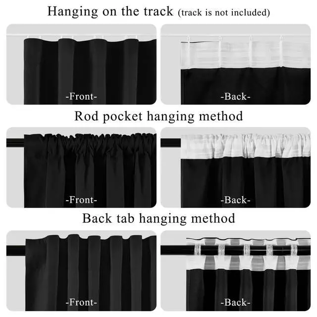 You can hang it in three ways: using a rod pocket, back tabs, or with the included hooks on your own track (The track is not included in the package).