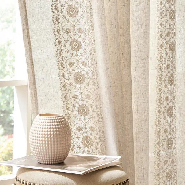embroidered design with its visually clean lines gives the curtain a modern twist from a rustic flax linen look.