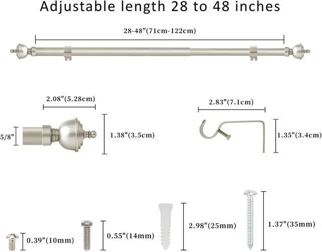 2. The front adjustable curtain rod measures 5/8" diameter and comes with Royale finials; the back adjustable curtain rod measures 1/2" diameter and comes with our exclusive design finials. Both rods extend from 28" to 48", 48 to 84" or 84" to 120".