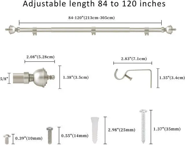 2. The front adjustable curtain rod measures 5/8" diameter and comes with Royale finials; the back adjustable curtain rod measures 1/2" diameter and comes with our exclusive design finials. Both rods extend from 28" to 48", 48 to 84" or 84" to 120".