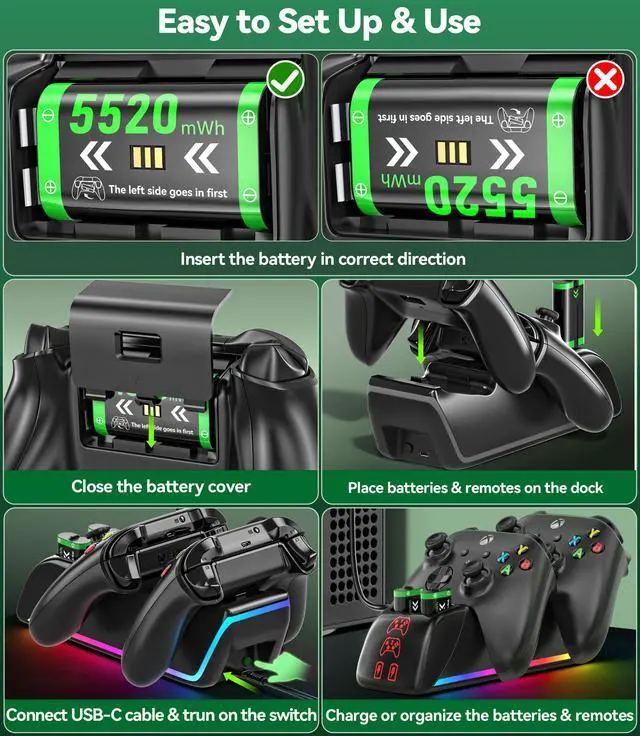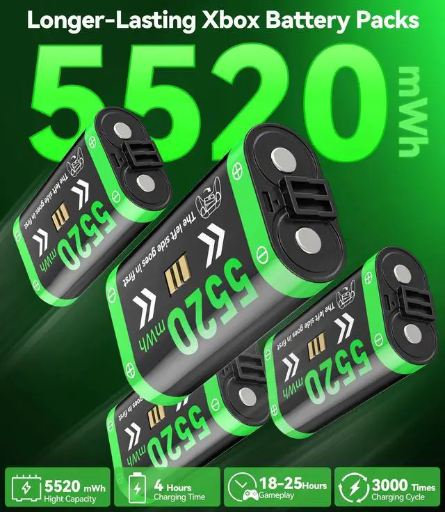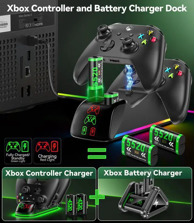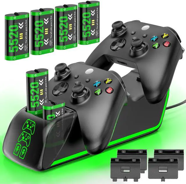 [ 4 X 5520mWh Rechargeable Battery Pack for Xbox Controllers] Xbox Series X Cases Xbox controller charger equipped with 4 packs 5520mWh Xbox rechargeable batteries, Xbox controller charger station allows 2 xbox batteries and 2 xbox remotes to be charged simultaneously or individually. Xbox Series Skins Rysker xbox rechargeable battery pack is compatible with Xbox One /xbox One X / Xbox One S / Xbox Series X|S/Xbox One Elite Controllers.
