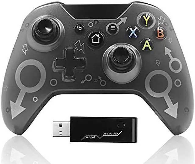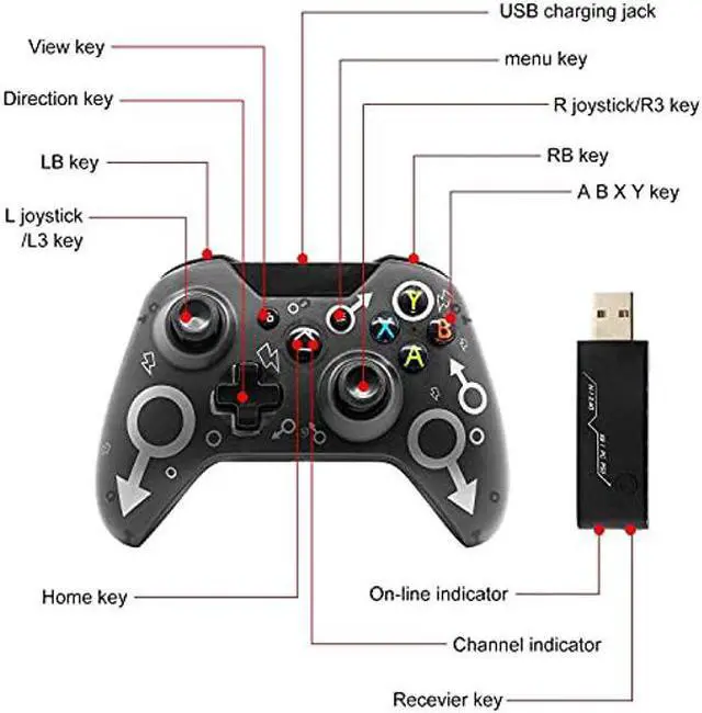 Note: The controller does not have Audio jack Features 1. 2.4GH z wireless technology, effective distance of about 33 feet 2. Supports dual motor vibration 3. Equipped with lithium batteries, operating up to 10 hours 4. Any driver is not needed and the controller will work when it Connects with XBONE, PS3 or PC. 5. It is easy to be switched to X-input or D-input on PC without Any driver 6. Button and joystick srespond sensitively and the control is handy 7. Up to 2 wireless controllers can be connected to your console at the same time. 8. You can enjoy the game even though the controller is being charged. 9. The wireless 2.4 G receiver can be upgraded by the software in a Computer. How to Connect to Xbox One 1. Plug the receiver into the USB port of the console, receiver's light flashes. 2. Press controller's HOME button, controller's light flashes. 3. When the controller's light and receiver's light are always on, the connection is successful. How to Connect to PC 1. The same way as connecting the XBOX.