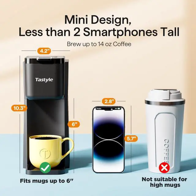 Things to Know Before You Buy: It is a mini coffee maker with dimensions of 8.2"D x 4.2"W x 10.3"H. Fit cups under 6 inches, not compatible with taller travel mugs. No adjustable brew size settings, brew coffee based on the amount of water added. Drip tray not included.