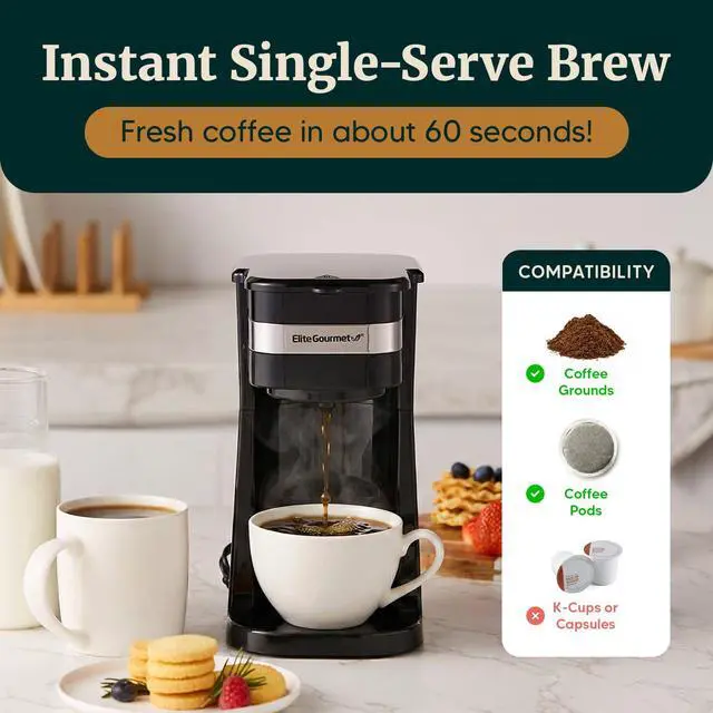 QUICK INSTANT BREW TIME: With the Elite Gourmet personal single-serve coffee maker, you can brew fresh coffee at home in under 60 seconds. Its great for On the go mornings or a quick pick me up to save valuable time for your busy life.
