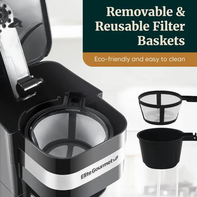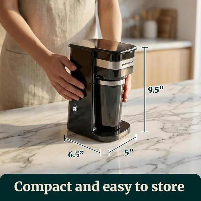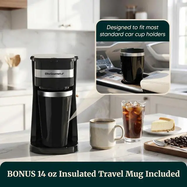 EVERYTHING YOU NEED: The Elite Gourmet Personal Single-Serve Coffee Maker has everything you need to enjoy hot fresh coffee. Comes complete with coffee maker base, travel mug, lid and reusable filter.