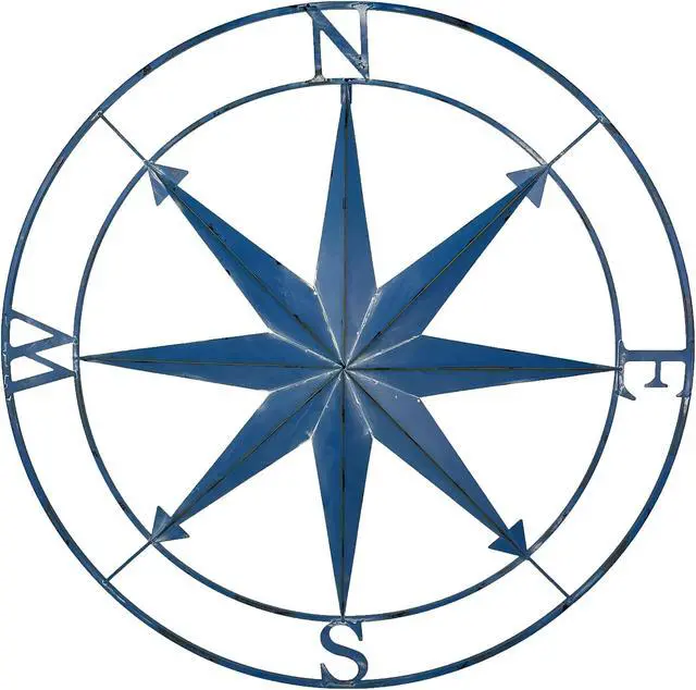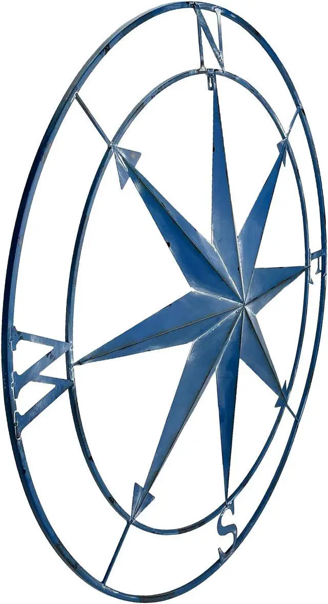 Elevate your decor with a touch of maritime charm using this large compass rose wall hanging. Measuring an impressive 39.25 inches in diameter, this nautical symbol boasts a distinctive Aegean blue distressed painted finish, adding a touch of coastal elegance to any space. Whether adorning the walls of a seaside patio or gracing a landlocked living room, this compass sculpture is designed to captivate attention and evoke a sense of maritime adventure. Crafted with precision, this decorative piece is thoughtfully detailed to bring the allure of nautical navigation into your home. The Aegean blue finish lends it an authentic weathered appearance, resembling a well-traveled maritime relic, and the compass rose design acts as a nod to seafaring traditions.