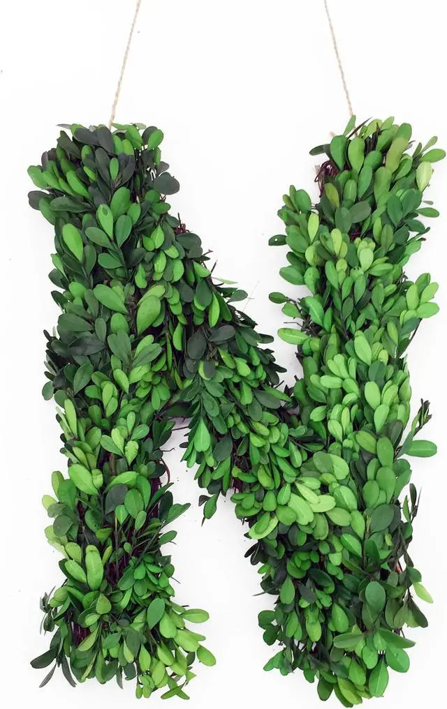 Bring modern style to your home or office with some elegant flair. Constructed of real natural preserved boxwood tied around a wire frame and finished with a rustic twine to hang it from, each letter is hand assembled to create a great personalized gift. Each letter measures approximately 12" tall. We offer all letters from A through Z plus the ampersand (&) symbol. Great to hang on your front door, in your house, in your office or anywhere else where you need to stake your claim. Don't settle for cheap plastic imitation boxwood.