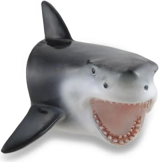 With swift and energetic momentum, sharks can leap right out of the water while attacking prey. Rest assured this shark head won`t cause any trouble as it pops out from behind the bar, busts through the patio, or hurdles into the media room! This cool 11.5 -inch (29 cm) high, 16-inch (41 cm) wide sculpture is sure to stop your friends dead in their tracks as it releases 10 inches (25 cm) from the wall creating a truly 3-D display! It easily hangs with a single nail or hook via the attached keyhole hanger on the back.