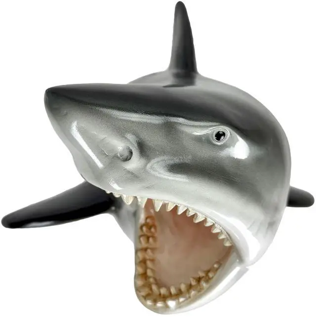 This 16 inch great white shark head wall mount sculpture brings bold nautical style and playful trophy decor to your home, office, or beach house walls. Crafted as a faux shark trophy, it delivers dramatic ocean themed wall decor that stands out in a man cave, kids ocean bedroom, coastal bathroom, or game room. Use it anywhere you want eye catching nautical wall decor with a fun sense of adventure. At about 11.5 inches high, 16 inches wide and 10 inches deep, this resin shark head has a strong presence without taking over the room.