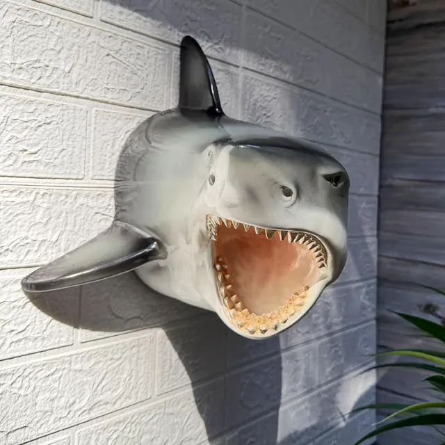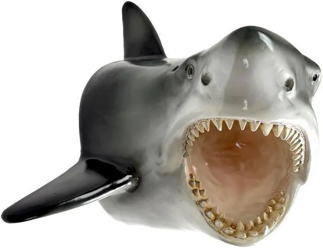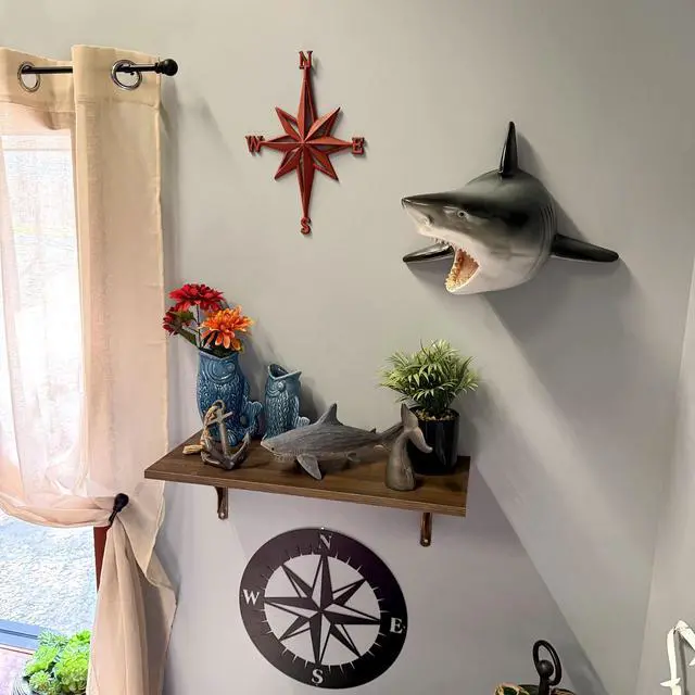 The size works well above a console table, next to a framed beach print, over a towel rack, or as part of a larger gallery wall of coastal art. Its projecting depth creates a three dimensional look that makes it feel like the shark is swimming right out of the wall. Cast from resin, this wall sculpture captures the sleek lines and powerful build of a great white shark. The gray and white painted finish suggests real shark coloring, while the detailed teeth and open mouth add lifelike drama. The back is flat for wall mounting; simply hang on a sturdy wall anchor or screw appropriate for your wall type, hardware not included.