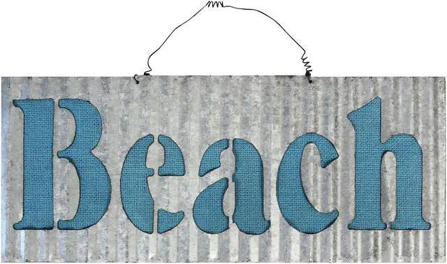 Create a charming coastal atmosphere in your home by decorating with this pretty "beach" sign. You could also purchase this sign as a sweet gift for any beach house owner.. Measures 19 x 10 3/4 x 1 1/4 inches. Made of tin and burlap fabric with wire hanger. Made by Young's, imported