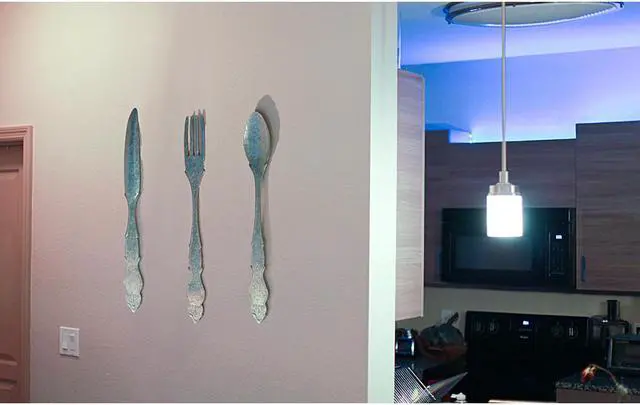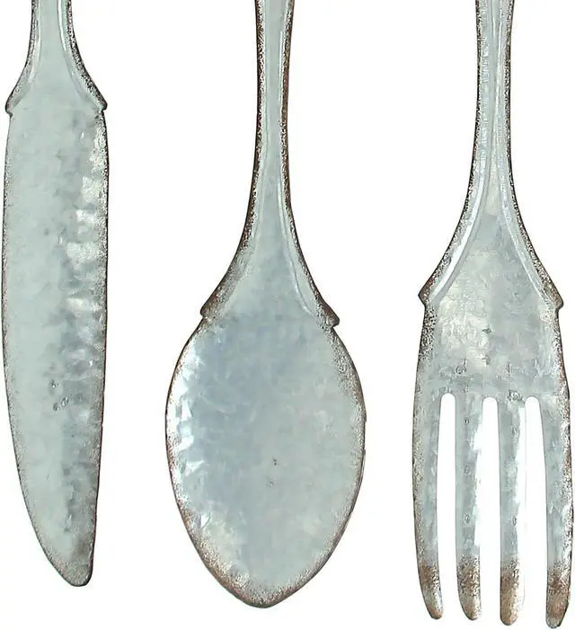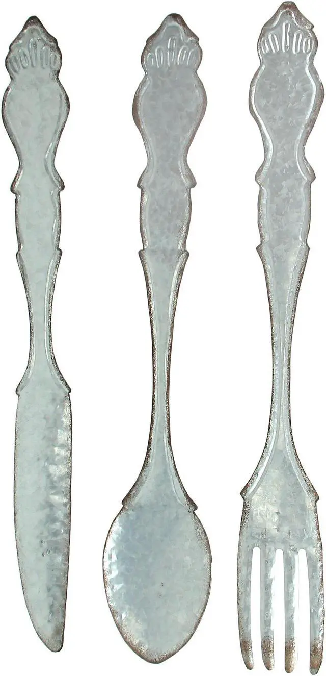 Elevate your home decor with our eye-catching oversized utensils, transforming any plain wall into a charming farmhouse masterpiece. Crafted from metal, this three-piece set features a classic fork, spoon, and knife design, each adorned with a rustic galvanized finish and beautifully distressed edges, exuding a weathered patina for added character. Your pride in your home is reflected in this unique decoration, offering a fresh and creative twist to your space. Arriving ready to hang with pre-installed triangle mounting hangers, these giant utensils effortlessly add a stunning farmhouse vibe to your kitchen or dining area.