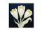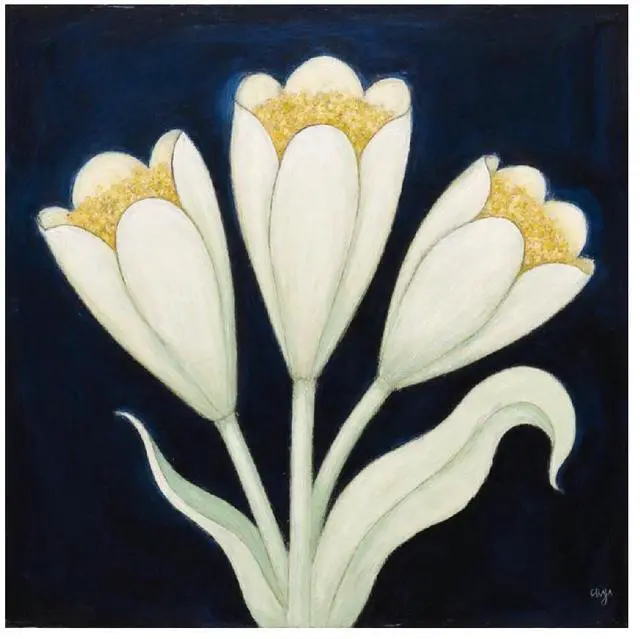 Three creamy white blooms with textured golden centers stand out against a deep navy backdrop, blending understated elegance with striking visual contrast.