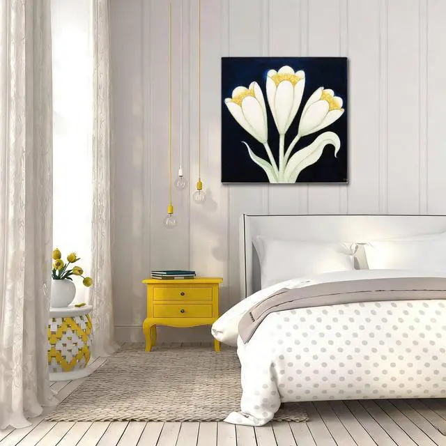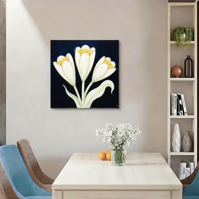 Youll receive a 16x16" "navy-backed pale blossom" muralyour package includes the finished canvas artwork, ready to hang right after unboxing.