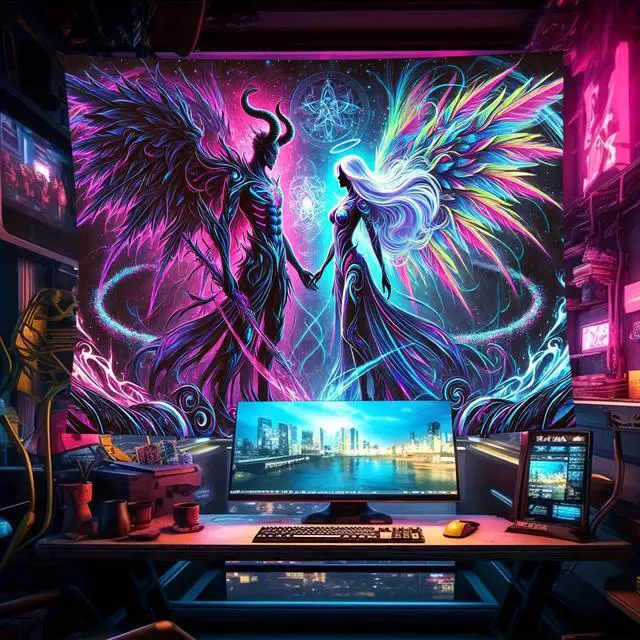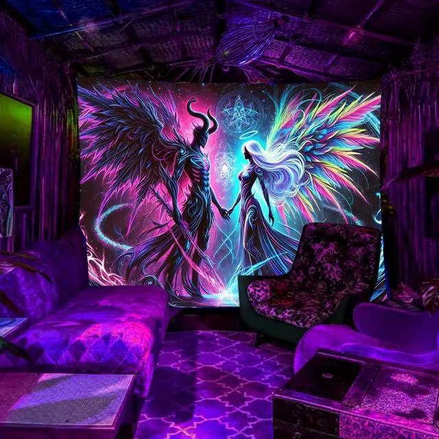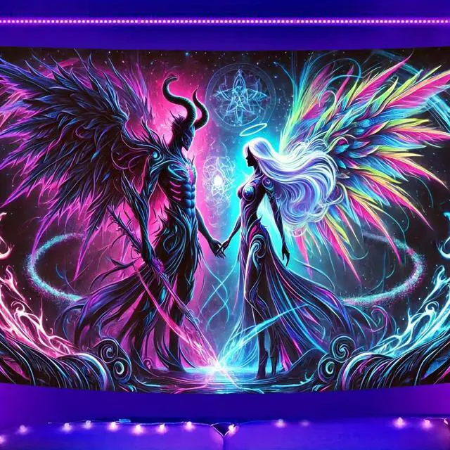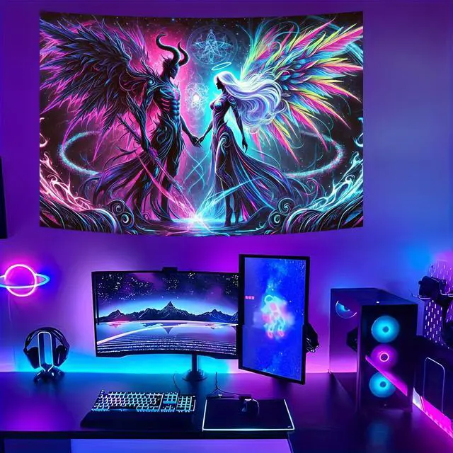 Glow in The Dark Devil Angel Tapestry 2D Flat, UV Reactive Neon Wall Art for Bedroom, Game Room, Dorm, Man Cave Decor, Prebuilt Pc Decor (90x60in)