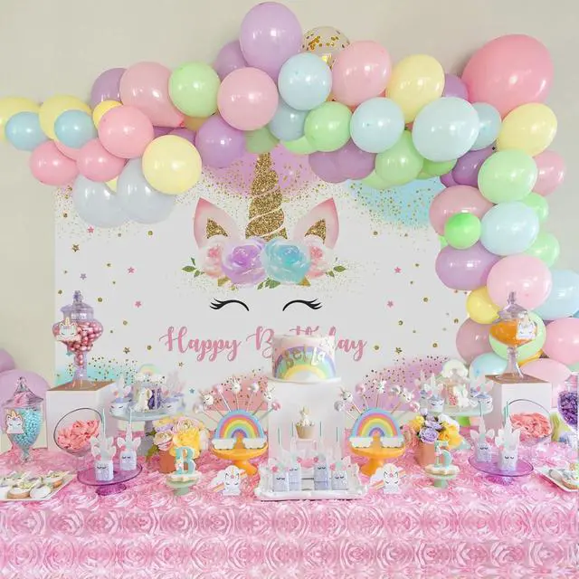 Various Size: This unicorn backdrop for girls' birthday measures 15.9 x 5.9 x 0.6 inches; simply clip, nail, or tape it to the wall or candy table supply props. Custom sizes are supported.