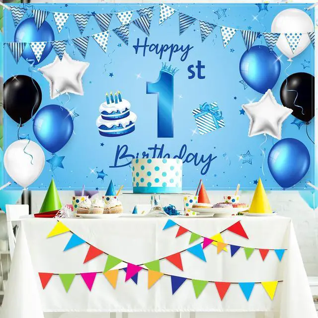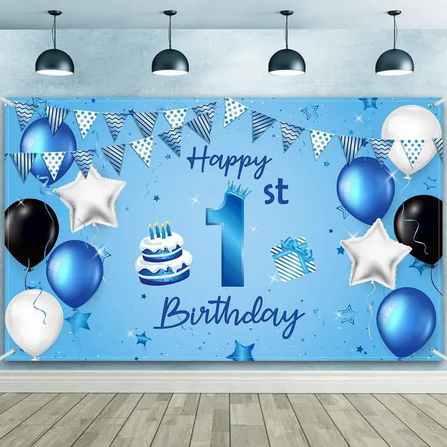 1st Birthday banner: This extra large 1st birthday background banner is designed with blue as the theme color, elegant design plus birthday elements such as cakes, gifts, balloons, flags, etc. Sweet and cute patterns help create a stylish party background and hold an unforgettable birthday party.