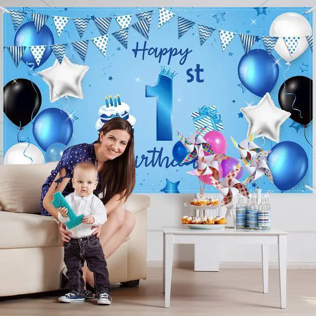 1st Birthday Backdrop Banner Blue Newborn Boys First Birthday Backdrop Photography Background for 1st Birthday Baby Shower Party Decorations Supplies 72.8 x 43.3 Inch