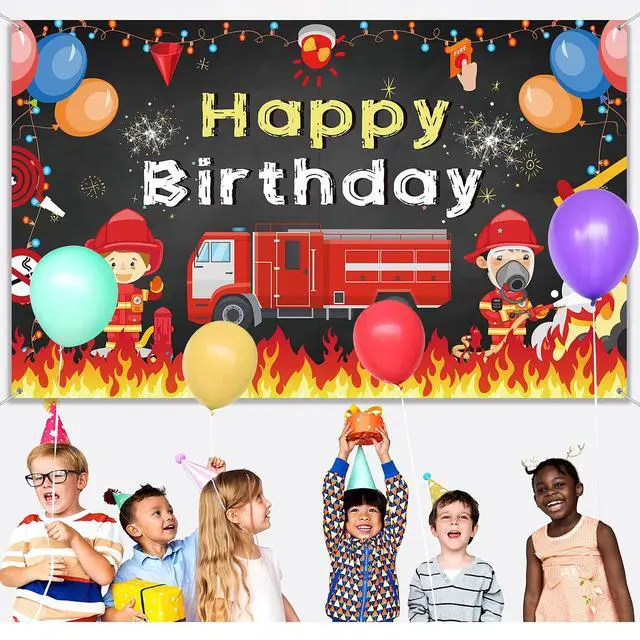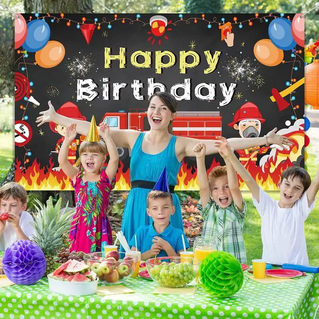 Bright and adorable patterns: This firetruck happy birthday backdrop features a variety of fire elements, such as fire trucks, firefighters, flames, water guns, sirens, and balloons. Its ideal for childrens birthday parties, 1st birthdays, and firetruck theme parties.