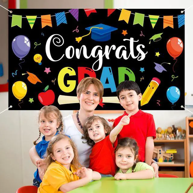 What You Get: You will receive 1pcs preschool congrats grad backdrop flag and 1pcs white rope. Our kindergarten backdrop banner flag measures 78.7 x 45.3 x 0.04 inches. It's large enough to suit any kindergarten graduation themed parties and satisfy most photo requirements.