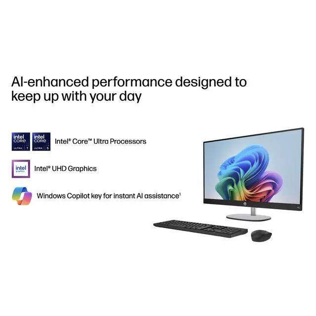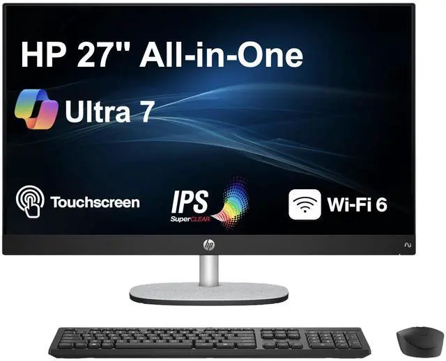 Model: HP 27 Form/Style: All in OneProcessor: 15th Gen Ultra 7-255U 2.00GHz Processor (upto 5.2 GHz, 12MB Cache, 12-Cores, 14-Threads, 2 Performance-cores)Memory: 32GB DDR5 SO-DIMMGraphics: Intel Graphics shared Integrated Graphics, Storage: 1TB PCIe SSD (Solid State Drive)Operating System: Windows 11 Home-64Display: 27" IPS FHD (1920x1080) 60Hz 16:9 Touchscreen DisplayConnectivity: 802.11ax Wifi, Bluetooth 5.4, RJ-45Ports/Slots:, 2 USB 2.0, HDMI, USB 3.2 Type-C, Headphone/Microphone Combo JackInput/Output: Webcam, Black, Wireless Keyboard, Wireless Mouse, Battery: 90W PSU, Other Features, Color: BlackWeight: 15lbProduct Dimensions (WxLxH): 20.15 IN x 24.15 IN x 7.4 IN