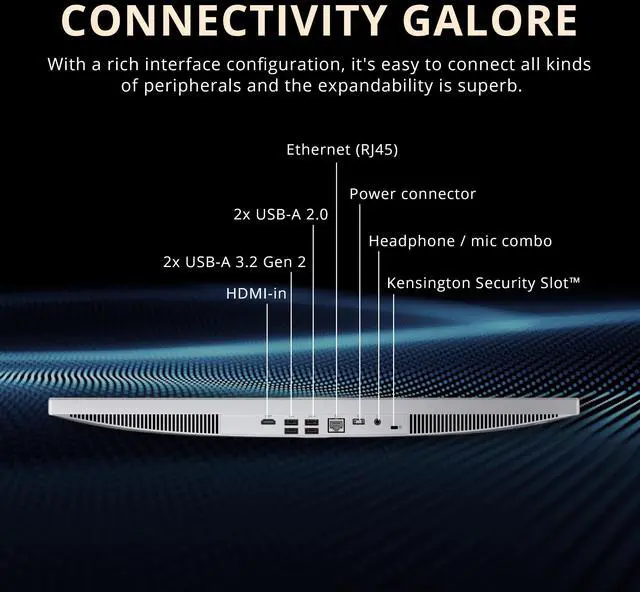 Windows 11 Home: 21.23"x16.65"x7.3", 9.47 lbs. Ports: 2x USB-A (Hi-Speed USB / USB 2.0), 2x USB-A (USB 10Gbps / USB 3.2 Gen 2), 1x HDMI-out 1.4b, 1x Ethernet (RJ-45), 1x headphone / microphone combo jack. Wired keyboard & mouse combo. Bonus Docking Station Set: 1x 7-in-1 Docking Station with 1TB Storage, 1x 32GB MicroSD Card with Adapter, 1x Type-C Data Cable, 1x 3-in-1 Charging Cable, 1x Suede Cleaning Cloth.