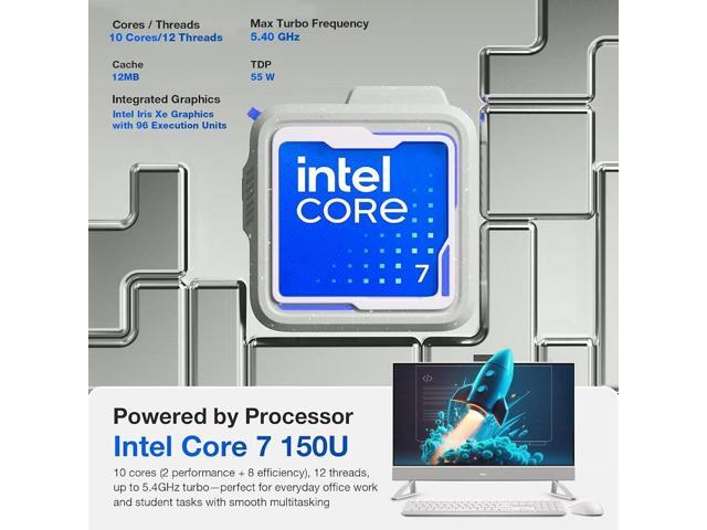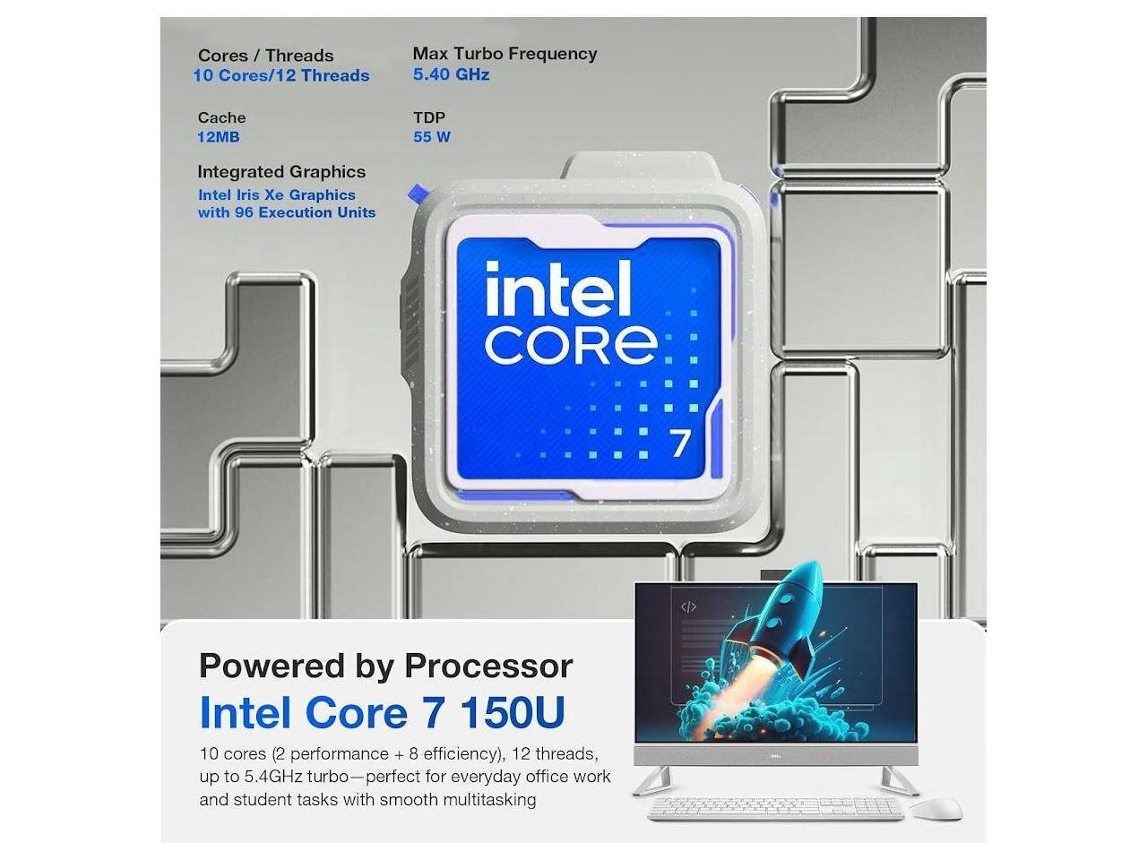 - Powerful Core 7 150U ProcessorDell Inspiron All-In-One Desktops are equipped with the latest Core 7 150U processor, boasting a turbo frequency of up to 5.4 GHz and featuring 12 MB cache, 10 cores and 12 threads