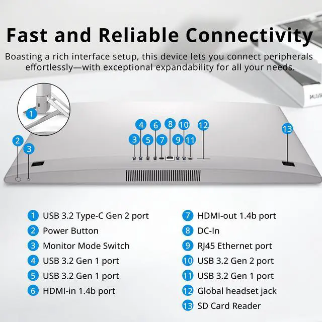 Windows 11 Home: 23.76" x 17.93" x 7.9", 14.5 lbs. Ports: 1x USB-C, 4x USB-A, 1x HDMI-in 1.4, 1x HDMI-out 1.4, 1x Headphone /microphone combo jack, 1x DC-in, 1x RJ45. Wi-Fi 6E + Bluetooth 5.3. Bonus Docking Station Set: 1x 7-in-1 Docking Station w/ 1TB Storage, 1x 32GB MicroSD Card w/ Adapter, 1x Type-C Data Cable, 1x 3-in-1 Charging Cable, 1x Suede Cleaning Cloth.