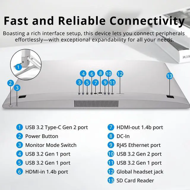 Windows 11 Pro: 23.76" x 17.93" x 7.9", 14.5 lbs. Ports: 1x USB-C, 4x USB-A, 1x HDMI-in 1.4, 1x HDMI-out 1.4, 1x Headphone /microphone combo jack, 1x DC-in, 1x RJ45. Wi-Fi 6E + Bluetooth 5.3. Bonus Docking Station Set: 1x 7-in-1 Docking Station w/ 1TB Storage, 1x 32GB MicroSD Card w/ Adapter, 1x Type-C Data Cable, 1x 3-in-1 Charging Cable, 1x Suede Cleaning Cloth.