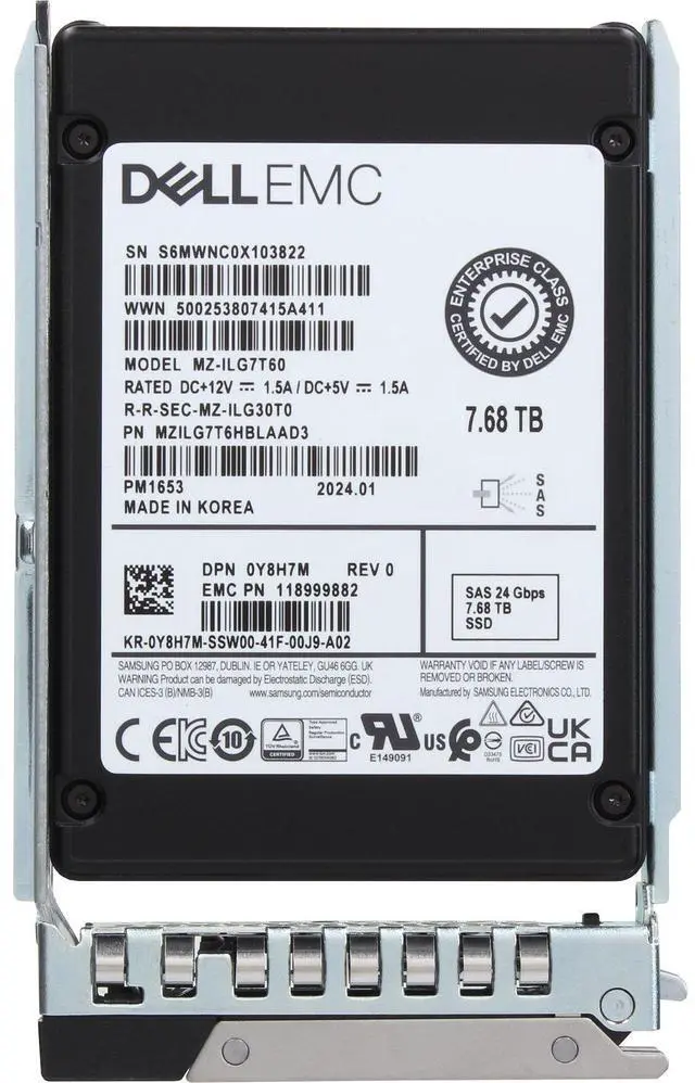 Up for sale is a Dell 7.68TB 24Gbps SAS TLC 2.5 RI SSD PM1653 (ME5) (Y8H7M-OSTK). All components are tested and firmware is updated.