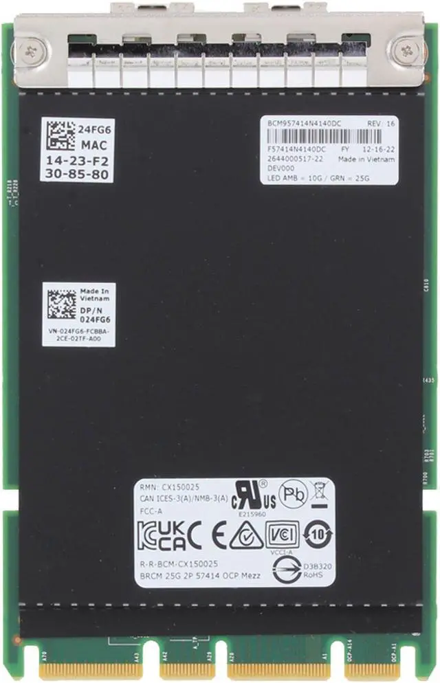Up for sale is a Dell Broadcom 57414 Dual 25GbE SFP28 OCP 3.0 (24FG6). All components are tested and firmware is updated.