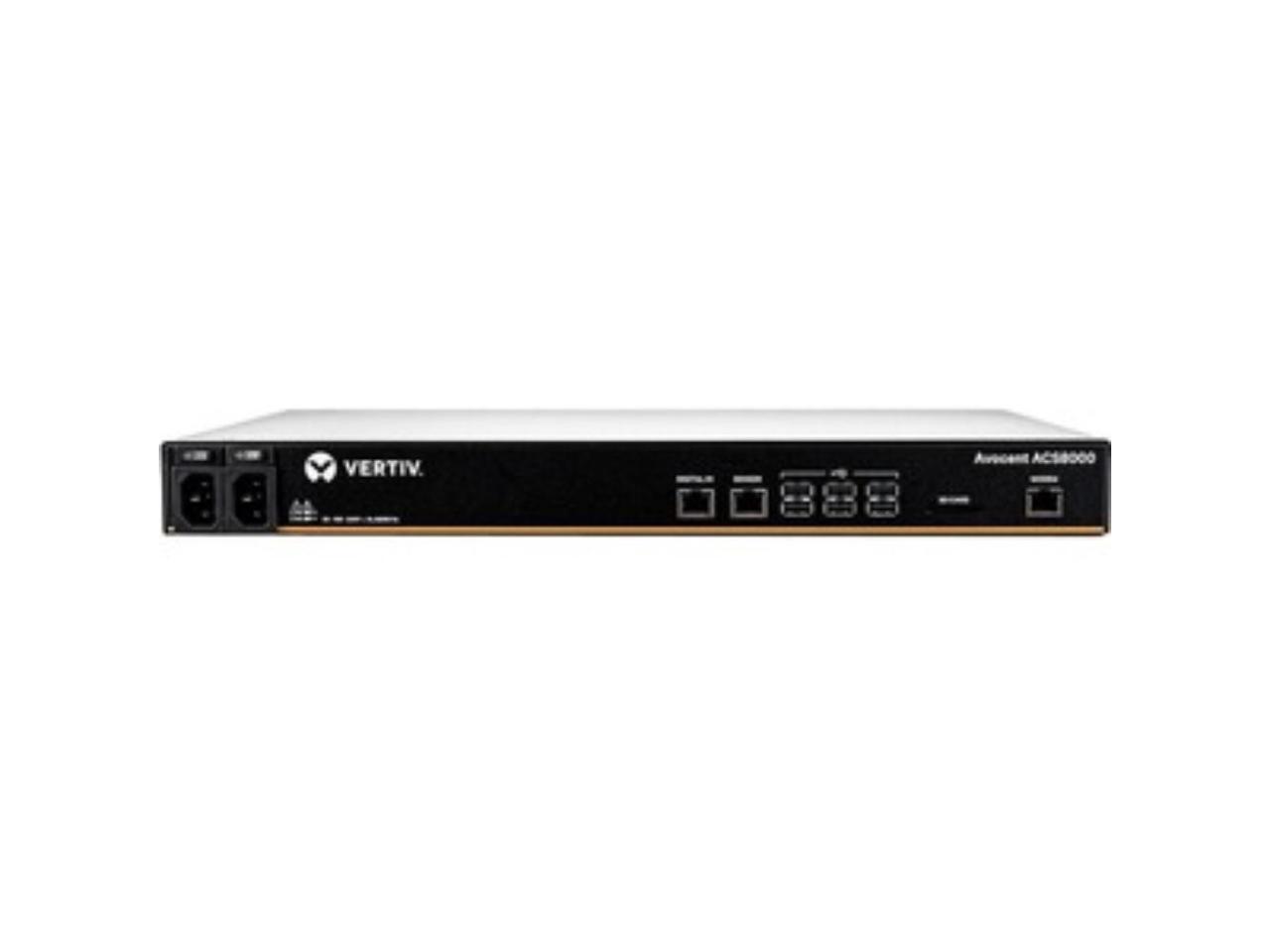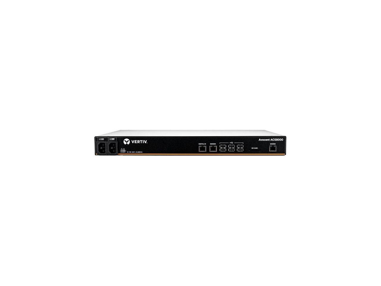 The Vertiv Avocent ACS 8000 Advanced Console Server system integrates connectivity features for secure in-band and out-of-band network remote management of IT assets from anywhere in the world. Includes dual AC power supply and analog modem.