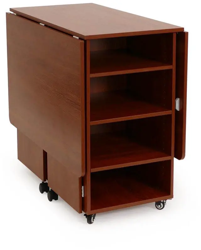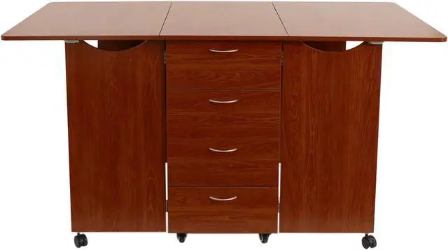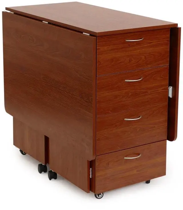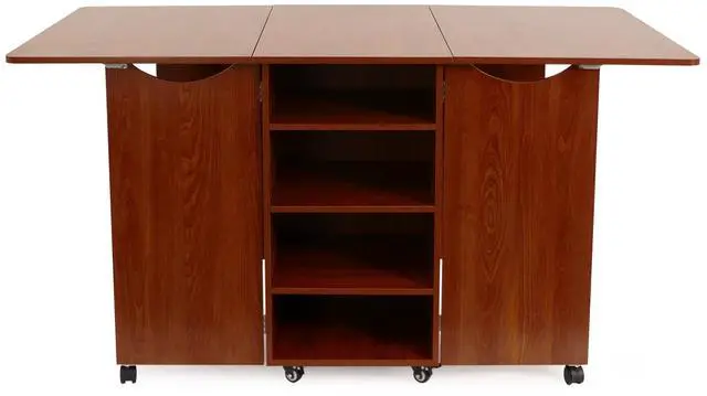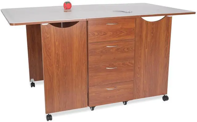 Color: Teak. Multi-functional cutting table with expansive cutting surface and dynamic storage. 2 fold out leaves create a 70"x 40"cutting surface for large projects.4 self-closing drawers with beautiful hardware and large storage capacity. 4 customizable rear shelves for secondary storage.A perfect complement to the Kangaroo Wallaby II, Aussie II or Kangaroo/Joey II sewing cabinets. 8 heavy-duty casters for stability and easy mobility.Cutting table leaves fold into compact space (20"x 40") to fit in any room when not in use. Kangaroo Sewing Furniture Lifetime Limited Warranty.Table Open: 70"W x 40"D x 36-1/4"H, Table Closed: 20"W x 40"D x 36-1/4"H, Top Drawer (x1): 14 3/4"W x 16 7/8"D x 8 1/16"H
