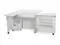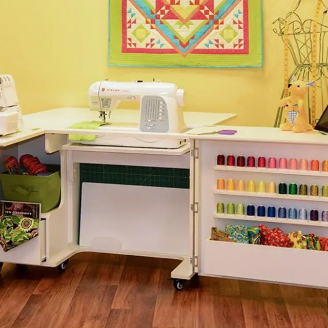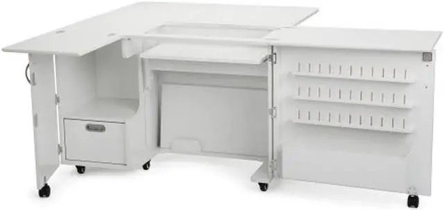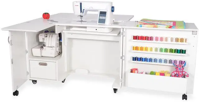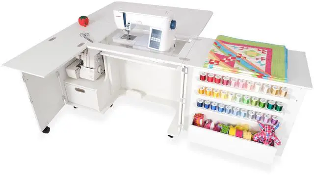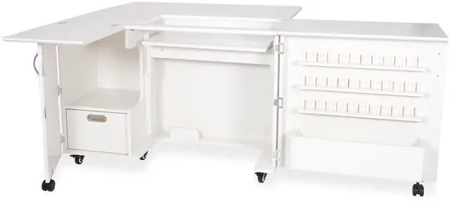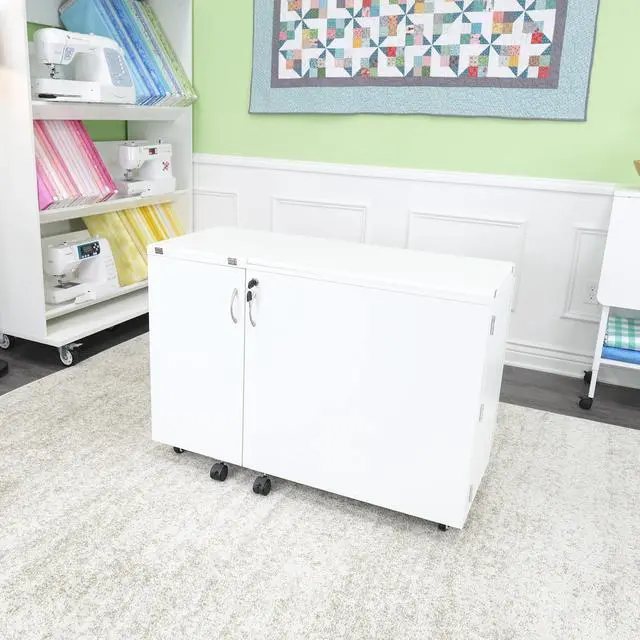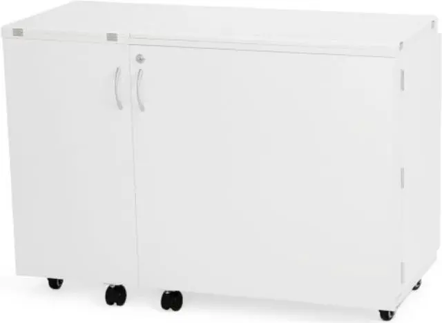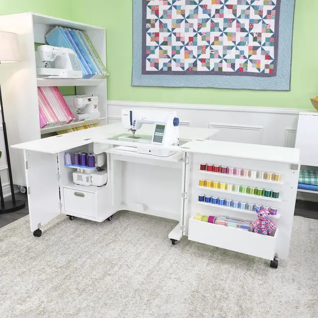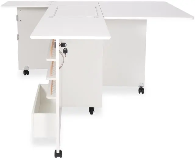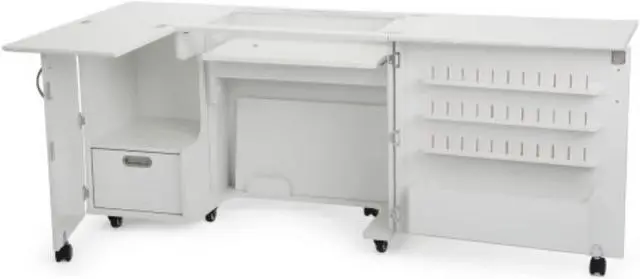 Closed Dimensions: Closed: 42 3/4" W x 19" D (front to back) x 30 1/4" H, Open: 70 5/8" W x 59 7/8" D x 29 1/2" HSewing Machines That Fit: Supports sewing machines up to 55 pounds. Width: 23 3/4" (left to right), Depth: 12 1/2" (front to back), Height: 14 1/2"Please measure your machine and include knobs, plugs, etc. that extend beyond the body of the machine.Cubby Width: 13 1/4". Cubby Depth: 14 3/4". Cubby Height: 15 1/2".Made from melamine laminate, MDF, and composite. Color: Ash White