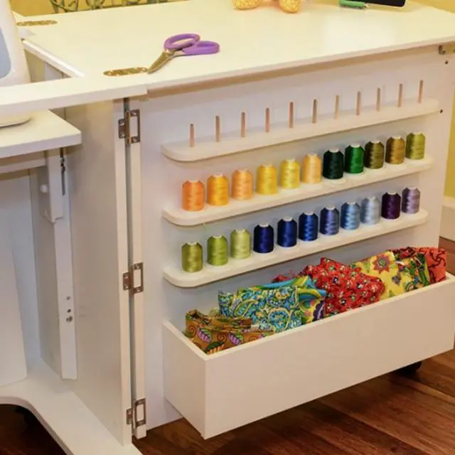 The Wallaby II sewing cabinet is perfect for the crafter who finds themselves trying to find the ideal space for their serger, sewing machine and more! Once your project is complete, safely conceal and secure your sewing machine, serger, fabric, and equipment by closing both doors and turning the key to lock them shut. Three-position hydraulic lift: Moves your machine into three positions: free-arm, flatbed and storage. Designed with gas strut mechanism. Quilt leaf stored on the back of the cabinet expands your workspace and prevents large quilts or large pieces of fabric from pulling and ending up on the floor. Plenty of storage: Three shelves with 33 spool holders, Door tray to hold magazines, patterns or extra fabric, Drawer for storing notions and other small accessories, The hideaway cubby is perfect for sergers or baskets of fabric. Cubby Width: 13 ¼". Cubby Depth: 14 3/4". Cubby Height: 15 1/2". Locking industrial casters for portability and stability. Kangaroo Sewing Furniture Lifetime Limited Warranty.