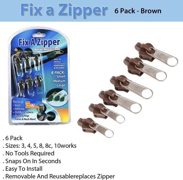 ASOTV - Fix-A-Zipper the ultimate solution for all your zipper repair needs. On your favorite jacket pants bag or tent offering a quick and easy fix. Snaps on in seconds and works. No tools required. Removable & Reusable. It can be started in the middle of a zipper that zips forward and backward. Works on plastic nylon or metal zippers. Fix-A-Zipper is a compact and portable zipper repair kit. Includes 6 zipper fasteners in 3 sizes.