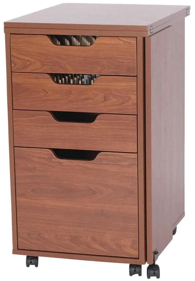 The Kiwi Storage Cabinet (Teak) is a versatile solution for organizing and enhancing your sewing and crafting space. Designed for multi-functional use, this cabinet features a built-in removable ironing board and a 17 3/8 x 11 3/8 cutting mat, making it ideal for storage, ironing, and cutting tasks. It offers an efficient storage system with 2 thread drawers, 1 small drawer, and a large drawer specifically designed to store an iron. The cabinet incorporates full-view, soft-closing drawer technology for smooth and quiet operation. When not in use, it closes into a compact unit, fitting seamlessly into any room. Five heavy-duty casters ensure both stability and easy mobility, allowing you to move the cabinet as needed. This cabinet is a perfect complement to other Arrow Group sewing cabinets and is crafted to safely conceal and secure all your sewing notions and equipment.
