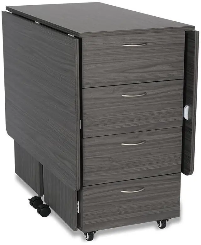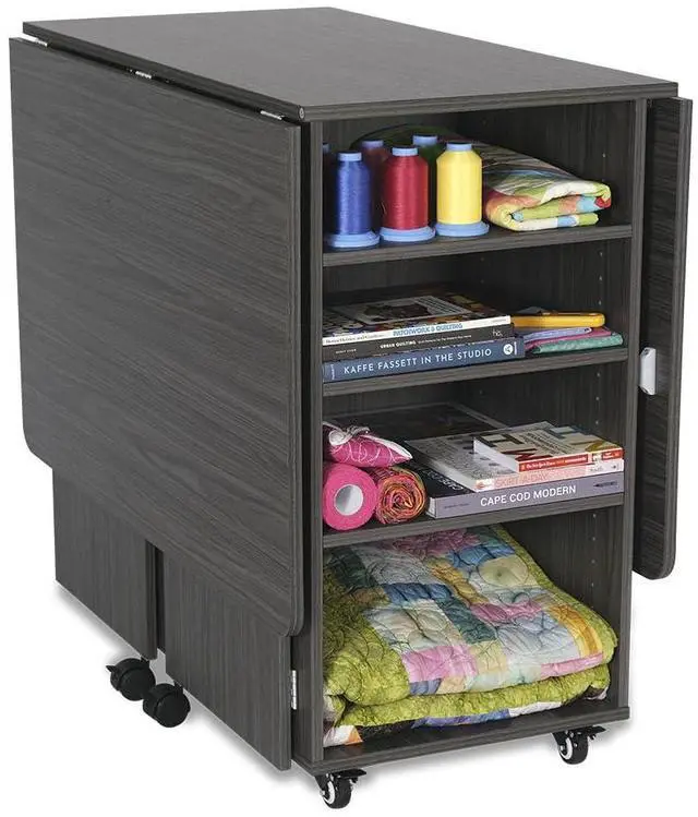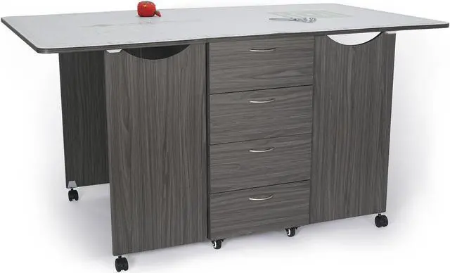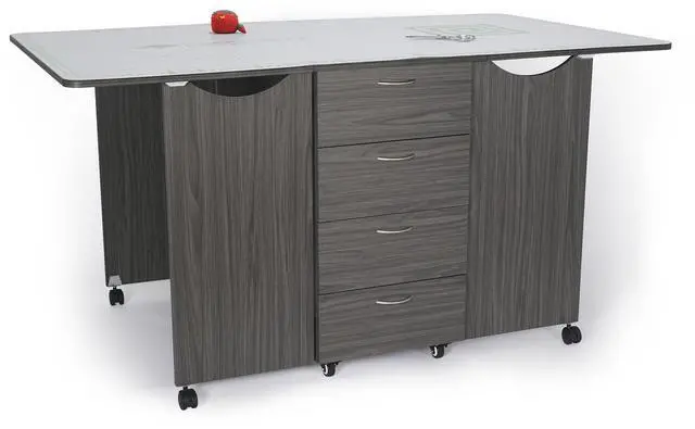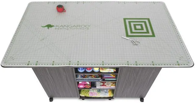 The Kookaburra Cutting Table by Kangaroo is a versatile solution designed for fabric crafters and sewing enthusiasts. Featuring a spacious work surface that expands to 70" x 40" with two fold-out leaves, this table accommodates large projects with ease. When not in use, it folds down to a compact 40" D x 20" W x 36 1/4" H footprint, making it ideal for any workspace size.