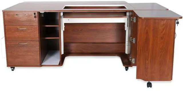 The Sydney Hydraulic XL Sewing Cabinet (Teak) from Arrow Group is expertly designed for sewing enthusiasts seeking maximum workspace and versatility. This cabinet features an extra-large hydraulic lift, capable of accommodating sewing machines up to 65 lbs., ensuring compatibility with even the largest models. The rear quilt leaf expands your worksurface, preventing large projects from pulling or resting on the floor, while the innovative right quilt leaf, right extension, and left drawer extension offer additional workspace for complex projects. Two support arms beneath the rear quilt leaf provide space for a second sewing machine, enhancing productivity. Available with either an XL Hydraulic Lift or Electric Lift, this cabinet is crafted to meet the needs of advanced fabric crafts and sewing professionals. Its elegant teak finish complements any craft room, combining functionality with style.