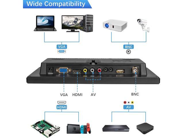 - [MULTIFUNCTIONAL] The monitor is very multifunctional and it designed to satisfy different customers’ different usage desire. It provided several different video input ports, including 1x HDMI port for Raspberry Pi, DSLR, DVR or other devices with HDMI port use, by plugging with a TV-stick, you can use it as a small TV. 1x VGA port for computer or laptop use. 1x AV port for DVD, VCD, TV-Box or security camera which has AV port and so on.